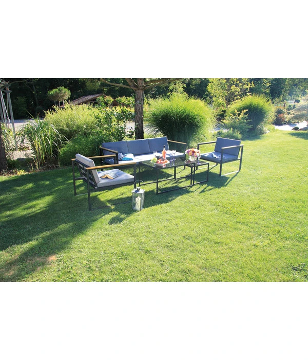 Ihr Traum ist schon länger eine Sitzgruppe mit Loungecharakter für Ihre große Terrasse, Ihren Rasen oder den Freisitz im Garten. Sie hatten dabei immer ein luftig modernes, aber dennoch edles Design vor Augen und sind nun glücklicher Weise auf die Acamp Lounge Space gestoßen. Denn sie wird mit ihrem geradlinigen, aber auch filigranen Stahlgestell zum eleganten Design-Eyecatcher, wo immer sie steht. Dabei setzen die Armlehn-Auflagen im warmen Naturton einen feinen Akzent und laden die edel und weich wirkenden Polster zum Hineinsetzen ein. Aber das ist noch lange nicht alles. Denn das zugehörige Tischensemble ist alles andere als normal und bringt so richtig Spannung ins Spiel. Schließlich handelt es sich dabei tatsächlich um zwei separate Tische in unterschiedlichen Höhen und Größen. Folgen Sie also Ihrer Eingebung und verwandeln Sie Ihre grüne Oase mit einer Acamp Lounge Space in eine Outdoor-Lounge der Extra-Klasse!