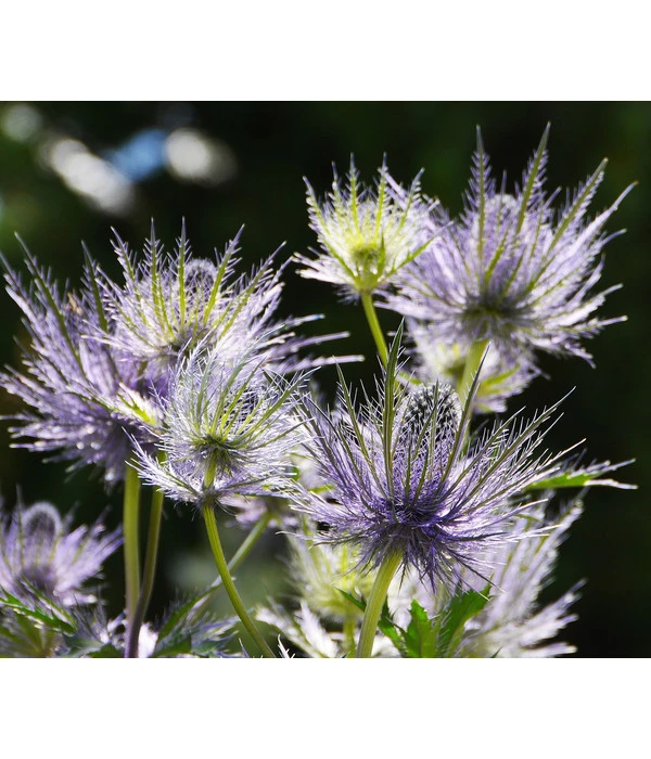 Eine Distel im Ziergarten? Gerne, wenn es sich um eine so edle Schmuckpflanze handelt wie die Edeldistel ‘Blue Star‘! Stolz reckt die auch unter dem Namen Garten-Mannstreu bekannte Pflanze ihre kräftigen Triebe 50-70 cm in die Höhe und lenkt allein schon dadurch die Blicke auf sich. Zwischen Juli und September aber werden Ihre Augen von den zahlreichen Blütendolden angezogen, die silbrig blau in der Sommersonne leuchten, umgeben von einem Strahlenkranz aus bedornten Hochblättern. Was Gartenplaner ebenfalls an der mehrjährigen Staude schätzen: sie lässt sich in die unterschiedlichsten Gartentypen integrieren. Ob im klassischen Bauerngarten, in modern naturnahen Gartenbeeten oder im Kiesbeet – die Edeldistel ‘Blue Star‘ ist immer ein ausdrucksstarker Blickfang. Bereichern Sie Ihre Gartenanlage mit diesem extravaganten Highlight, dann machen Sie zugleich auch Bienen und Schmetterlingen eine Freude!