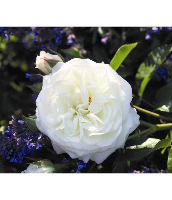 Die cremeweißen Blüten sind zum Beispiel eine tolle Ergänzung für Staudenbeete mit weiß blühenden und graugrün belaubten Stauden. Oder man kombiniert sie klassisch mit blauem Ziersalbei und rosafarbenem Storchschnabel zu einem Farbdreiklang. Die Rose ‚Alabaster®‘ macht als kompakt wachsende Beetrose auch im Kübel eine gute Figur und verschönert mit ihrer Blütenpracht im Sommer und Herbst Terrasse oder Balkon. Natürlich darf man hierfür regelmäßiges Gießen und Düngen nicht vergessen.