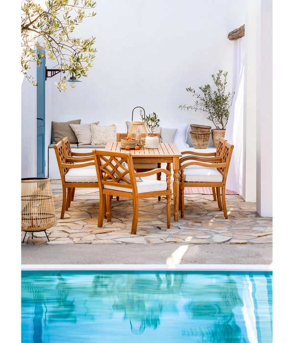 Teakholz ist ein besonders edles Hartholz, das sich aufgrund seiner herausragenden Outdoor-Eigenschaften ideal für Gartenmöbel eignet. Dabei begeistert es trotz seiner Härte und Witterungsbeständigkeit mit einer angenehm glatten, warmen Oberfläche und einer charakteristischen Maserung. Diese fällt naturgegeben bei jedem Tisch etwas anders aus und macht ihn so zu einem individuellen Einzelstück, das sich mit jedem Jahr etwas mehr Patina zulegt und damit noch an Ausstrahlung gewinnt. Das Holz für den Dehner Diningtisch Savona stammt selbstverständlich zu 100% aus nachhaltiger Waldwirtschaft und ist FSC®-zertifiziert.