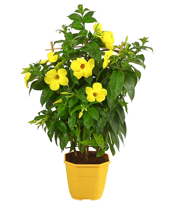 Ihre Fans sind sich einig: Die Goldtrompete ist eine der schönsten Kletterpflanzen und macht der bekannteren Dipladenie, der sie ein wenig ähnelt, echte Konkurrenz. Im Gegensatz zur Dipladenie schmückt sich die Allamanda cathartica mit sonnengelben, trompetenartigen Blüten, die im Sommer über dem glänzenden, sattgrünen Laub leuchten. Was muss das erst für ein fantastischer Anblick sein, wenn man die Pflanze am Naturstandort in den undurchdringlichen Regenwäldern Brasilien entdeckt, wo die zahlreichen Blüten in dem Halbdunkel besonders hell leuchten! Aber auch in unseren Wohnungen hier in Mitteleuropa ist die Goldtrompete ein Blickmagnet im Raum. Vor allem, weil sie nicht nur eine ungebremste Blühfreude zeigt, sondern auch vor Wachstumsenergie nur so sprüht und in Windeseile an einem Spalier oder einer anderen Kletterhilfe bis in Höhen von 200 cm klettert. Gönnen auch Sie sich den Anblick dieser traumhaft schönen Tropenpflanze, die auch unter dem Namen Dschungelglocke bekannt ist.