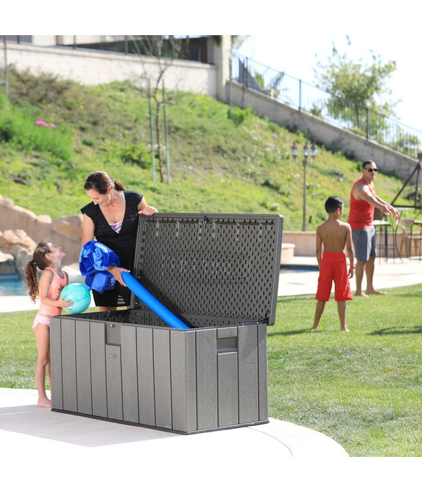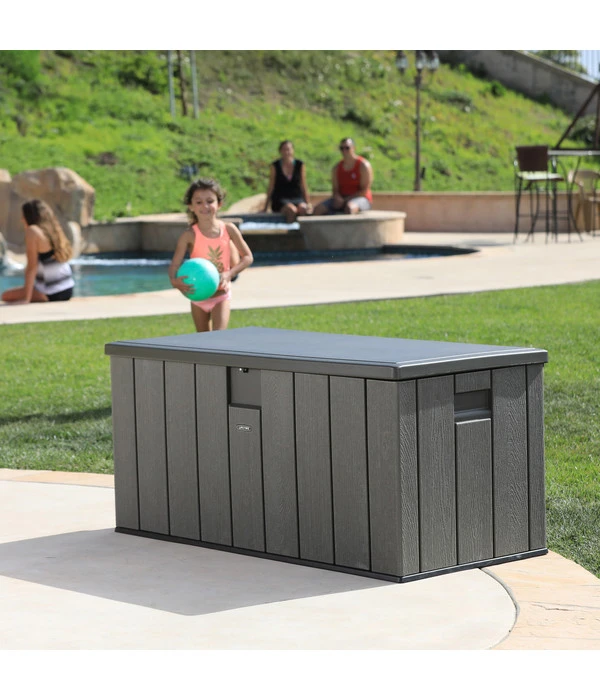 Sie sind schon lange auf der Suche nach einer robusten Aufbewahrungsmöglichkeit, die Ihnen hilft, auf Ihrer Terrasse oder auf Ihrem Balkon einfach Ordnung zu halten? Dann gehört die praktische Kissenbox Harmony von Lifetime unbedingt in Ihren Einkaufswagen! Die äußerst stabil gefertigte Truhe ist ideal dafür geeignet, um die Polster und Sitzkissen Ihrer Gartenmöbel oder das Spielzeug Ihrer Kinder zuverlässig zu verstauen. Zudem haben Sie alle benötigten Sachen immer gut sortiert und stets griffbereit. Bei Bedarf können Sie den Inhalt der Kissenbox Harmony von Lifetime mit der vorhandenen Vorhängeschloss-Vorrichtung zuverlässig vor dem Zugriff Unbefugter schützen. Auch lässt sich die Box mithilfe der seitlich angebrachten Griffschalen einfach umpositionieren.