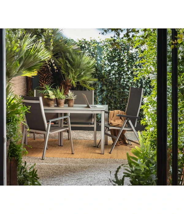 Sie wollen gutes Design, aber nicht auf Kosten des Komforts? Oder gar der Qualität? Dann könnte der MWH Klappsessel Elements Ihr neuer Terrassen-Partner werden! Denn der MWH Klappsessel Elements vereint auf formschöne Weise eben diese Eigenschaften. Das Gestell aus Aluminium ist stabil und wiegt doch nur gut 5 kg, ist aber bis 120 kg belastbar. Die Sitz- und Rückenfläche bestehen aus modernem Textilen-Gewebe, das superkomfortabel und dabei extrem strapazierfähig und witterungsbeständig ist. Die Rückenlehne ist in 5 Positionen verstellbar, so dass Sie sicher die Stellung finden, die Ihnen in dem Moment am besten gefällt. Außerdem braucht der MWH Klappsessel Elements erfreulich wenig Platz, weshalb er auch ideal für den Einsatz auf schmalen Balkonen oder kleineren Terrassen ist. Sollten Sie den Platz einmal für etwas anderes brauchen, lässt sich der Sessel praktisch zusammenklappen und in die Ecke stellen. Und mit der dezenten Farbgebung trifft der MWH Klappsessel Elements genau den richtigen Ton für alle Liebhaber modernen Designs.