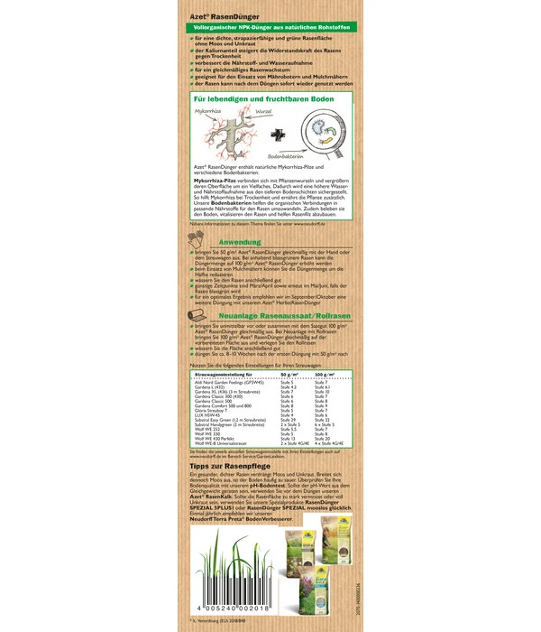 Ihr Garten ist Ihnen in den letzten Jahren ganz hervorragend gelungen und im Moment konzentrieren Sie sich auf Ihren Rasen. Der macht sich ganz gut, könnte aber durchaus Unterstützung brauchen. Der richtige Moment für Neudorff Azet® Rasendünger. Dieser speziell auf die Bedürfnisse der unzähligen Rasenpflanzen abgestimmte NPK-Dünger (8+3+4) wurde rein aus natürlichen Rohstoffen hergestellt und ist entsprechend vollorganisch. Er versorgt Ihren Rasen mit allen wichtigen Spurennährstoffen, die er für einen gesunden, kräftigen und vor allem dichten Wuchs benötigt und die ihn stark und widerstandsfähig machen. Die im Granulat enthaltenen Mykorrhiza-Pilze und Mikroorganismen sorgen für einen natürlich fruchtbaren Boden, in dem die Pflänzchen sich kräftig und gesund entwickeln und alle nötigen Nährstoffe gut aufnehmen können. Der hochwertige Spezialdünger punktet mit einer natürlichen Sofort- und Langzeitwirkung. Freuen Sie sich mit Neudorff Azet® Rasendünger auf einen dichten, strapazierfähigen Rasen!