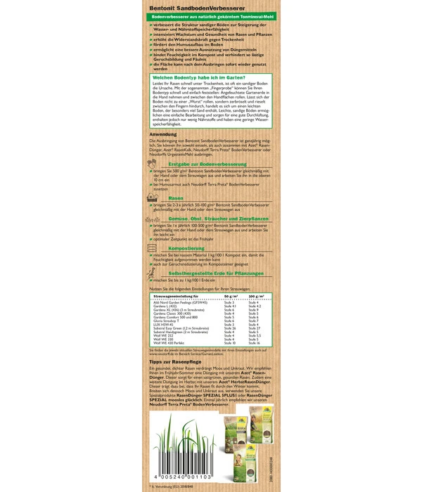 Der Bodenhilfsstoff von Neudorff kann • das ganze Jahr angewandt werden, im Sommer wie im Winter. Wir empfehlen Ihnen, je nach Bodenzustand zwischen • 100 und 500 g/m² auszubringen. Oder anders ausgedrückt: Mit 1 kg Bentonit können Sie 100 Liter Erde spürbar verträglicher für Ihre Pflanzen machen. Die Anwendung ist kinderleicht und auch für nichtberufliche Anwender geeignet. Der SandbodenVerbesserer kann • überall in Ihrem Garten zum Einsatz kommen, • auch Ihre Kübelpflanzen werden positiv auf seine wohltuende Wirkung reagieren und sogar Ihre Pflanzen • im Kräuterbeet werden noch besser gedeihen.