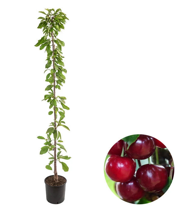 Für echte Kirschenfans beginnt die Kirschenzeit schon im April, denn dann steht der Kirschbaum in voller Blüte. Und wenn der strahlend weiße Blütenschmuck von Bienen, Hummeln und anderen Bestäuberinsekten umschwärmt wird, ist sicher: Es gibt Kirschen satt! Und was für welche! Die Früchte der Säulenkirsche ‘Claudia‘ sind appetitlich dunkelrot, mittelgroß und mittelfest. Und der süß-aromatische Geschmack ist einfach himmlisch. Das Beste aber: Diesen Genuss können auch Besitzer eines kleinen Gartens erleben, denn die Säulenkirsche ‘Claudia‘ wächst schnurgerade in die Höhe, bleibt aber rank und schlank, so dass sie nur wenig Platz in Anspruch nimmt. Verzichten Sie nicht auf eigene Kirschen und holen sich die Säulenkirsche ‘Claudia‘. Und gleich im nächsten Juni kann geerntet werden!