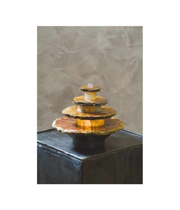 Der edle Brunnen aus Schieferstein sorgt garantiert dafür, dass Sie als Betrachter in die Stille der eigenen Mitte entführt werden. Das ist nicht nur beruhigend, sondern zugleich traumhaft schön zum Angucken. Dabei gleitet das Wasser gleichmäßig über konzentrische Kreise des Brunnens und wird von innen her beleuchtet. Profitieren Sie zudem von den individuellen Einstellungsmöglichkeiten – egal, ob alles aus, Pumpe und Beleuchtung ein oder Pumpe ein und Beleuchtung aus. Der Schieferbrunnen ist ein handgearbeitetes Unikat und misst einen Durchmesser von etwa 22 Zentimetern sowie eine Höhe von rund 19 Zentimetern. Zögern Sie nicht und entscheiden Sie sich für dieses wunderschöne Deko-Highlight von Seliger!