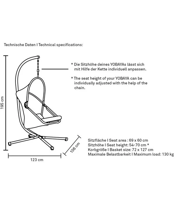 Jeder Mensch ist anders. Deshalb können Sie die Sitzhöhe beim Siena Garden Hängesessel Yobaya variabel von 54–70 cm einstellen. Das stabile Stahlgestell überzeugt nicht nur durch dezentes, formschönes Design, es ist vor allem äußerst stabil, standsicher und zudem witterungsbeständig, da pulverbeschichtet. Es ist mit wenigen Handgriffen aufgebaut und trägt Lasten bis 130 kg.