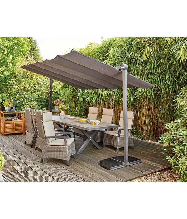 Sie wünschen sich einen eleganten und effektiven Sonnenschutz für Ihren Garten? Dann wird Ihnen das Sonnensegel Enna von Siena Garden bestimmt gefallen. Die dezente Farbgebung und der minimalistische Stil passen zu jeder Terrassen- oder Garteneinrichtung und machen Sie sehr flexibel, was den Standort Ihres Sonnenschutzes angeht. Dank der intelligenten Konstruktion ist ein beidseitiges, stufenloses Neigen des Daches möglich, wodurch Sie die Abschirmung an den jeweiligen Sonnenstand ohne Probleme anpassen können. So müssen Sie sich zu keinem Zeitpunkt Gedanken über eine zu starke Sonneneinstrahlung für sich und Ihre Familie machen, denn unter dem Segel Enna aus spinndüsengefärbtem Polyester sind Sie immer gut geschützt.