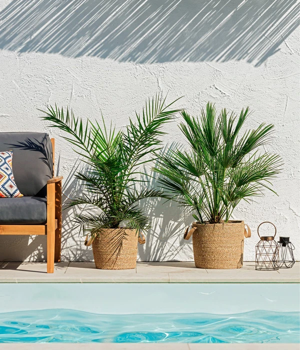 Vielleicht geht es Ihnen so wie vielen anderen: Beginnt die XXL Kanarische Dattelpalme ihr exotisches Flair zu verbreiten, wächst die Lust auf noch mehr Urlaubs-Feeling. Eine Lust, die wir stillen können, denn wir haben noch andere beeindruckende Outdoor-Palmen im Angebot. Da sind zum Beispiel die stattlichen Hanfpalmen oder die dekorativen Zwergpalmen, die gerne zusammen mit der Kanarischen Phönix-Palme Ihren Outdoor-Bereich in ein exotisches Urlaubsparadies verwandeln.